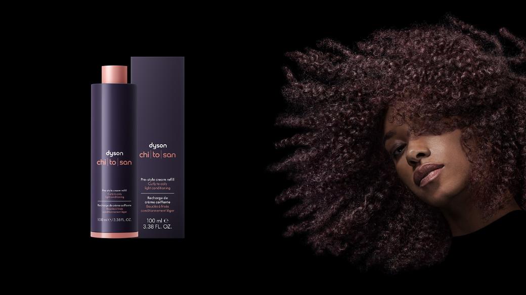 Dyson Chitosan™ Pre-style cream Curly to coily light conditioning is developed for hair that naturally forms spiral curls and ringlets, tighter corkscrew or S-curls, or closely-coiled Z-patterns. Its lighter blend of conditioning agents, including grapeseed and argan oils, is best suited to thinner strands that are easily weighed down by product.