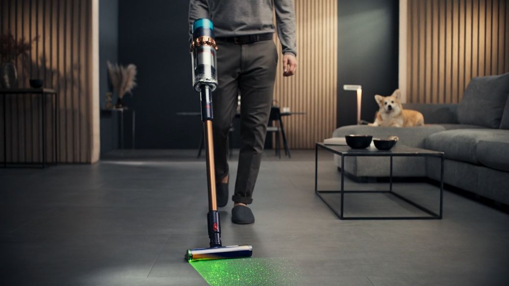 Dyson Gen5detect vacuum being used to pick up debris from carpet.